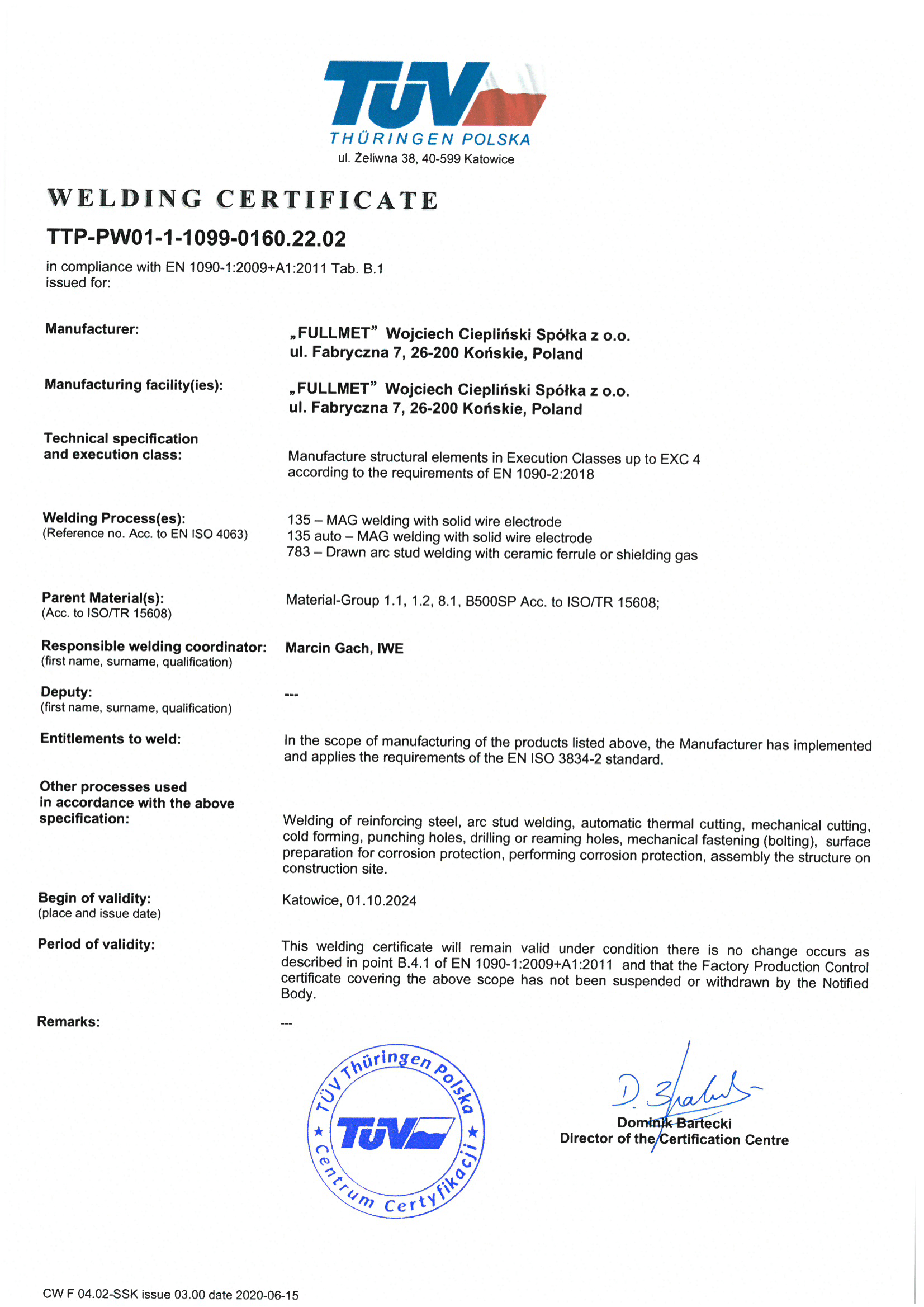 Welding certificate